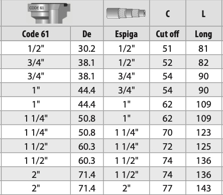 La Espiga Brida Código 61 está diseñada para conexiones de brida en sistemas hidráulicos, proporcionando una solución segura y eficiente para aplicaciones industriales.