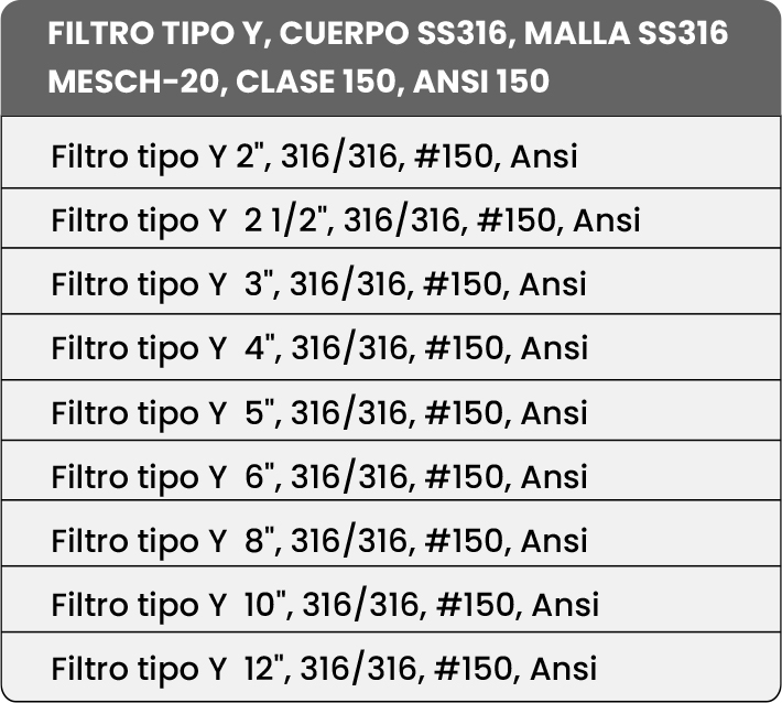 El Filtro Tipo Y 316 ANSI 150 está diseñado para la separación de partículas sólidas en sistemas de conducción de fluidos industriales, protegiendo válvulas, bombas y equipos de proceso. Su fabricación íntegra en acero inoxidable SS316 ofrece una excelente resistencia a la corrosión, asegurando larga vida útil incluso en entornos químicos o de alta temperatura.