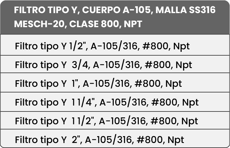 El Filtro Tipo Y A-105 NPT está diseñado para retener partículas sólidas presentes en fluidos como vapor, agua y gases industriales, protegiendo válvulas, bombas y equipos de control. Su cuerpo de acero al carbono A-105 ofrece una estructura robusta, mientras que su malla e interior en acero inoxidable aseguran una filtración eficiente y una alta durabilidad bajo condiciones exigentes de presión.