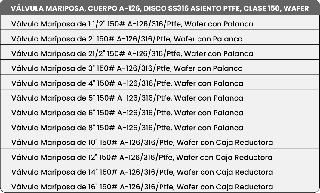 La Válvula de Mariposa tipo wafer Clase 150, con cuerpo en hierro dúctil A-126 recubierto en epoxi, disco en acero inoxidable SS316 CF8M y asiento en PTFE, está diseñada para manejar fluidos corrosivos con alta fiabilidad. El cuerpo de hierro dúctil proporciona resistencia mecánica, mientras que el acero inoxidable 316 asegura máxima protección contra la corrosión. El asiento en PTFE ofrece un sellado químicamente inerte, compatible con una amplia gama de sustancias agresivas. Su diseño wafer permite una instalación compacta y rápida entre bridas, optimizando espacio y mantenimiento.