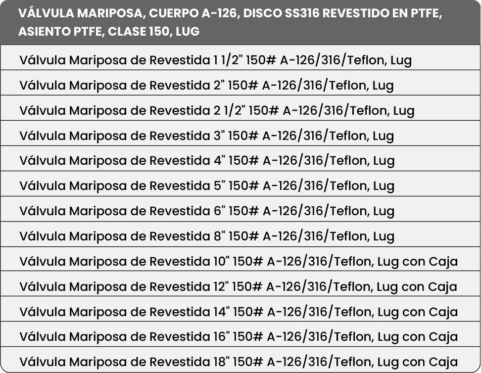 La Válvula de Mariposa tipo lug Clase 150, con cuerpo en hierro dúctil A-126 recubierto en epoxi, disco en acero inoxidable SS316 CF8M revestido en PTFE y asiento en PTFE, está diseñada para aplicaciones de máxima exigencia frente a la corrosión. El recubrimiento en PTFE en el disco y el asiento asegura compatibilidad con una amplia gama de químicos agresivos, ofreciendo sellado confiable y larga vida útil. Su configuración lug permite instalación entre bridas con pernos independientes, facilitando el mantenimiento y el desmontaje por un solo lado.
