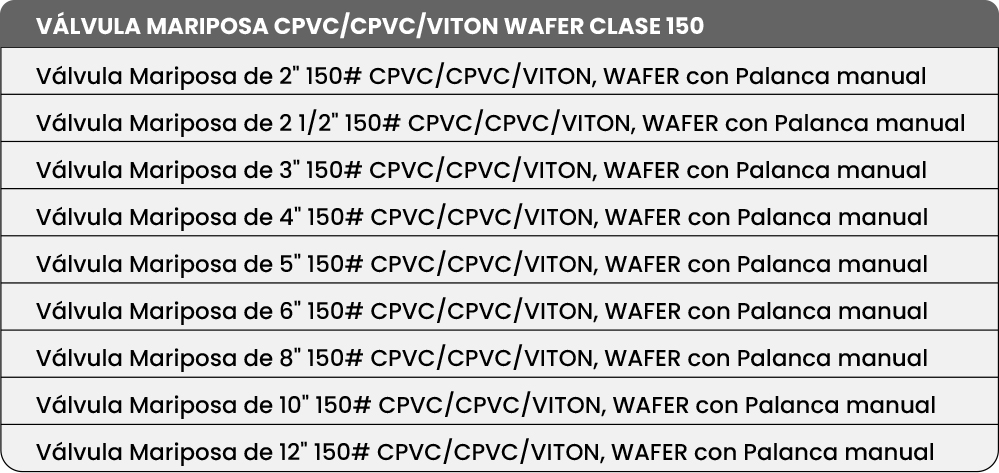 La Válvula de Mariposa de cuerpo en CPVC y disco en SCPVC, con vástago en acero inoxidable SS410 y asiento en Viton, ofrece un excelente desempeño en el control y aislamiento de fluidos corrosivos. Su diseño wafer Clase 150, compatible con la norma ASME B16.1 125/150, permite una instalación compacta y rápida entre bridas. El uso de CPVC en el cuerpo y SCPVC en el disco asegura una alta resistencia química y a temperaturas moderadas, mientras que el sello en Viton garantiza estanqueidad y durabilidad frente a una amplia gama de productos químicos.