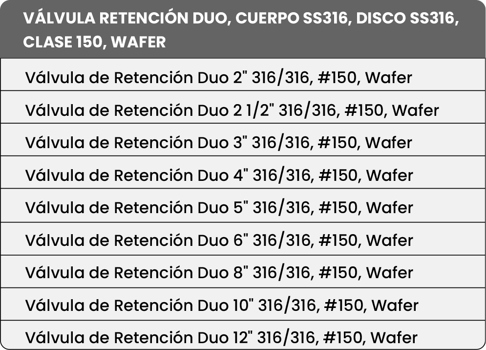 La válvula de retención Duo Check Wafer Inoxidable está diseñada para permitir el flujo en una sola dirección, evitando el retorno de fluidos y garantizando una protección eficaz de bombas y equipos en sistemas industriales. Su cuerpo en acero inoxidable CF8M y disco en SS316 aseguran una excelente resistencia a la corrosión, incluso en ambientes agresivos y de alta exigencia.