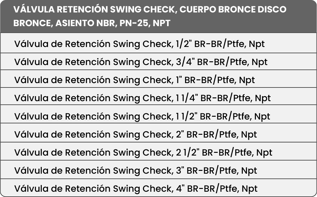 Aplicación: sistemas de conducción de agua potable, aire o aceites ligeros, donde se requiere una válvula confiable y de alta resistencia para controlar el sentido del flujo.