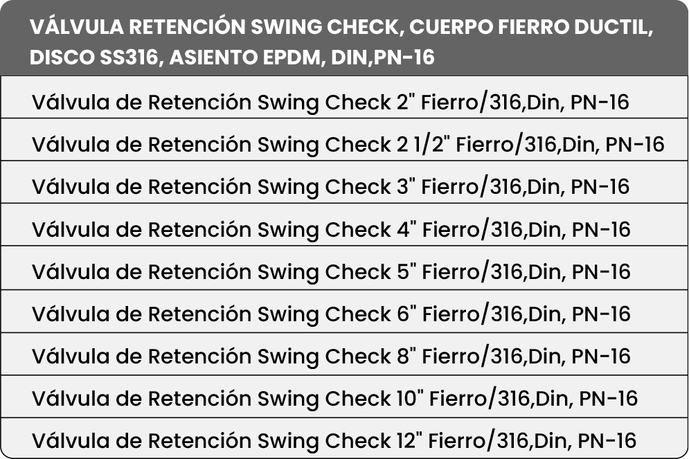 La Válvula de Retención Swing Check Norma DIN PN-16 está diseñada para permitir el paso del fluido en una sola dirección, evitando el retroceso y protegiendo bombas, líneas de conducción y sistemas de presión. Fabricada en fierro dúctil con recubrimiento epóxico y asiento en acero inoxidable, ofrece una solución confiable para redes de agua industrial y aplicaciones de media presión.